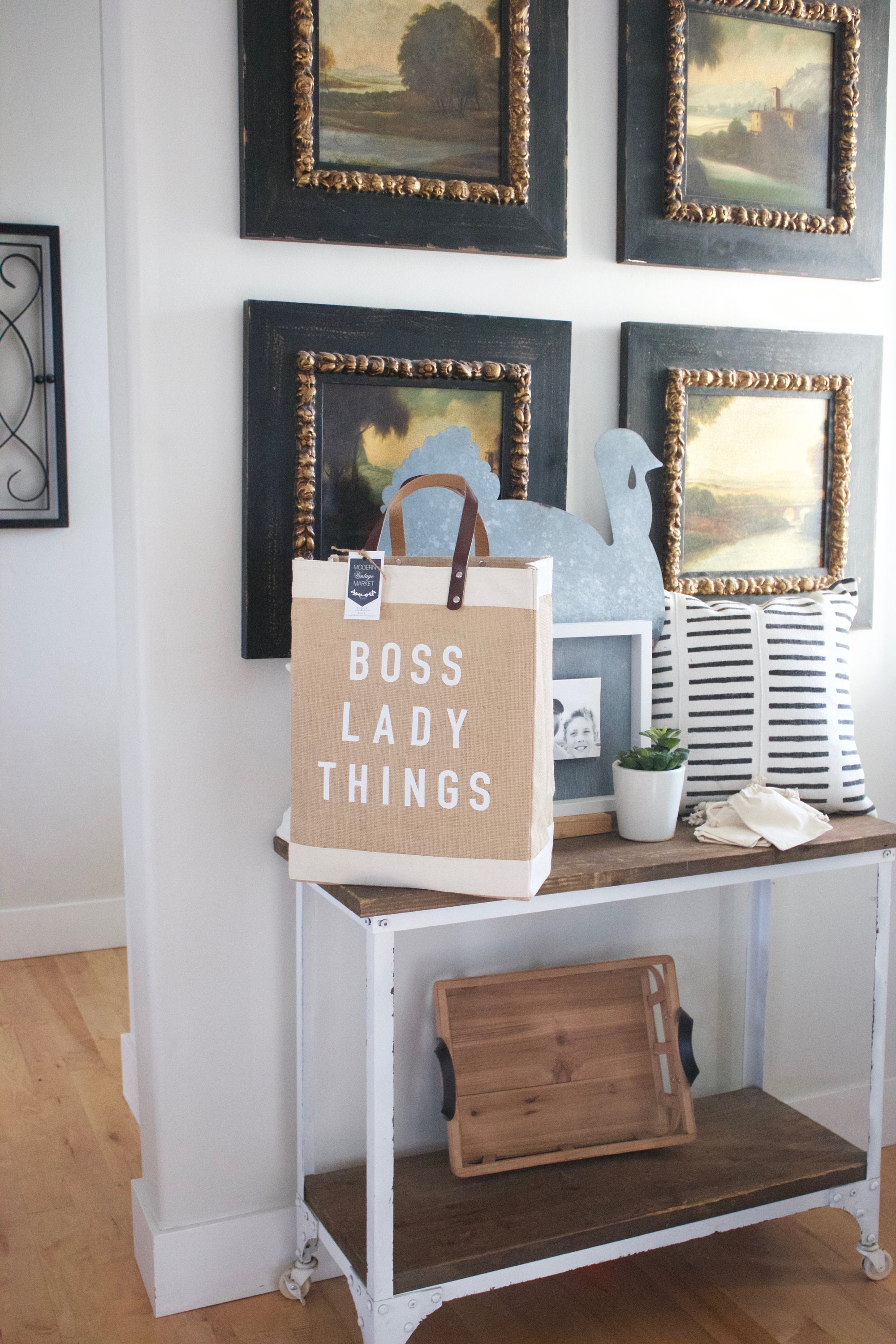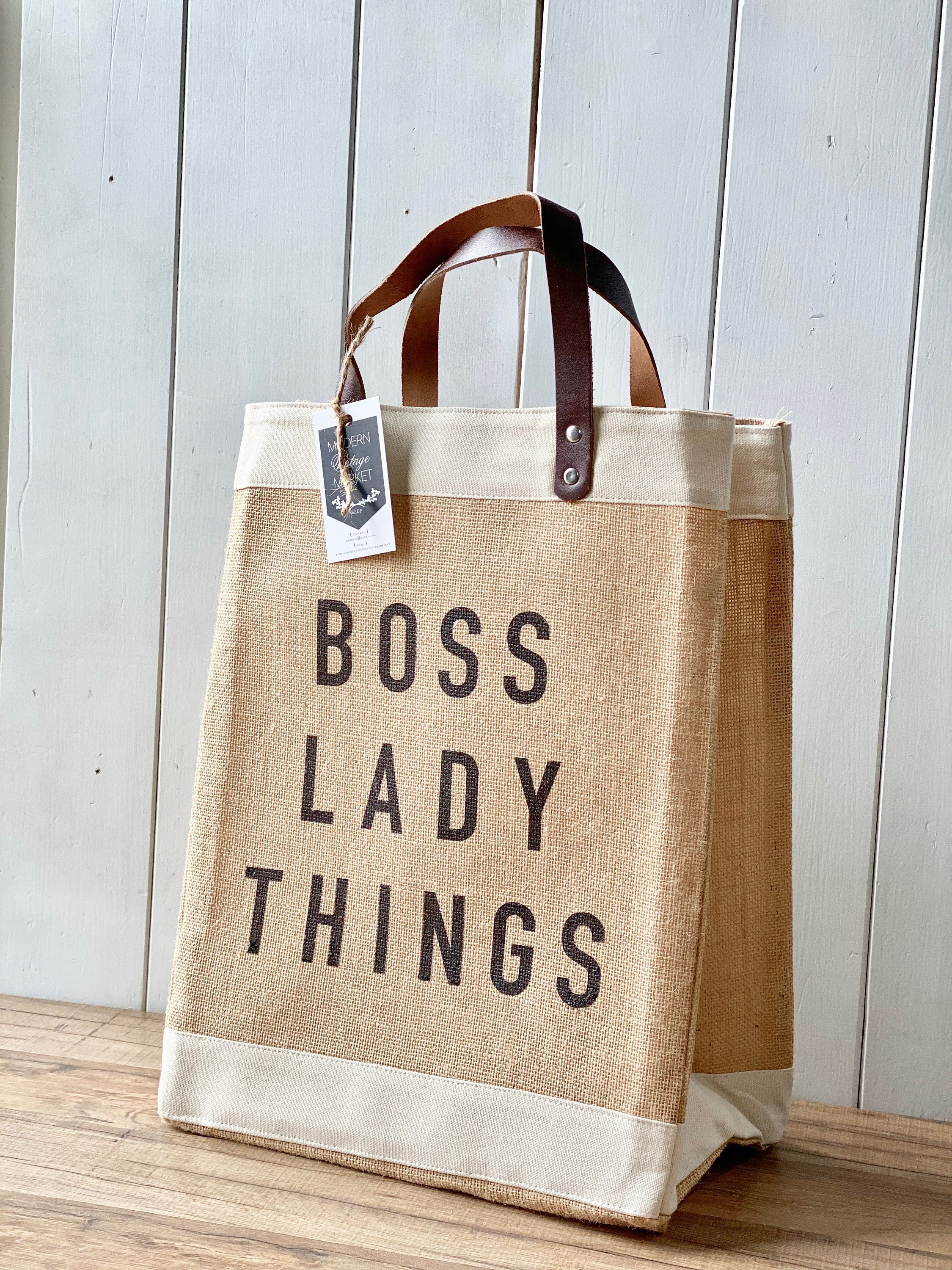 Our classic market jute tote with "Boss Lady Things" has leather handles,